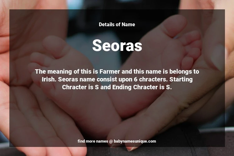 The name Seoras is chosen by those who are willing to find Unique Boy Baby Names. The meaning of this is Farmer and this name is belongs to Irish Origin. Baby Name Seoras consist upon 6 chracters. Starting alphabet is S and ending alphabet is S. This name is used primarily by parents who are considering unique baby names for Boy. The Zodiac Sign suitbale for this name are;