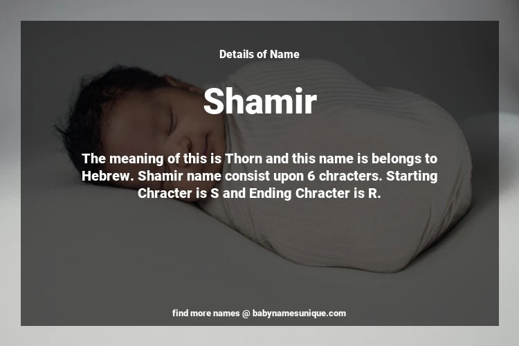 The name Shamir is chosen by those who are willing to find Unique Boy Baby Names. The meaning of this is Thorn and this name is belongs to Hebrew Origin. Baby Name Shamir consist upon 6 chracters. Starting alphabet is S and ending alphabet is R. This name is used primarily by parents who are considering unique baby names for Boy. The Zodiac Sign suitbale for this name are;