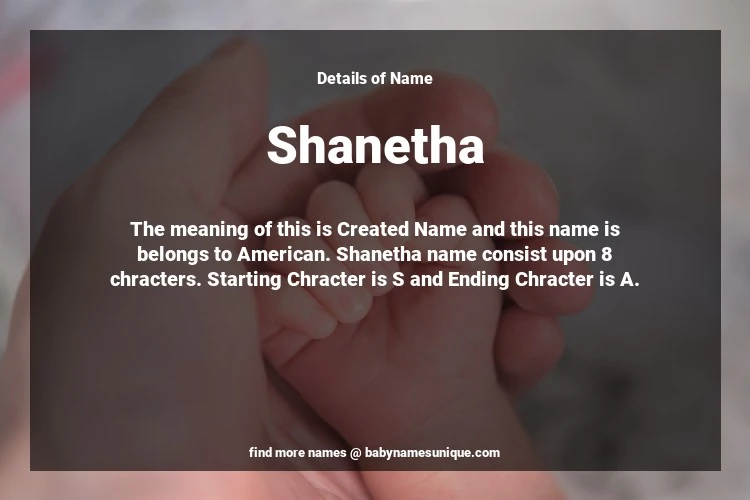 The name Shanetha is chosen by those who are willing to find Unique Transgenders Baby Names. The meaning of this is Created Name and this name is belongs to American Origin. Baby Name Shanetha consist upon 8 chracters. Starting alphabet is S and ending alphabet is A. This name is used primarily by parents who are considering unique baby names for Transgenders. The Zodiac Sign suitbale for this name are;