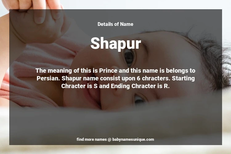 The name Shapur is chosen by those who are willing to find Unique Boy Baby Names. The meaning of this is Prince and this name is belongs to Persian Origin. Baby Name Shapur consist upon 6 chracters. Starting alphabet is S and ending alphabet is R. This name is used primarily by parents who are considering unique baby names for Boy. The Zodiac Sign suitbale for this name are;