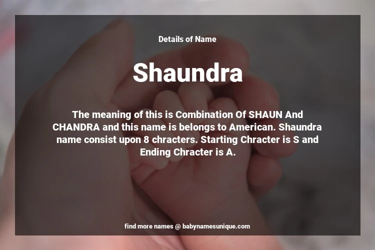 The name Shaundra is chosen by those who are willing to find Unique Transgenders Baby Names. The meaning of this is Combination Of SHAUN And CHANDRA and this name is belongs to American Origin. Baby Name Shaundra consist upon 8 chracters. Starting alphabet is S and ending alphabet is A. This name is used primarily by parents who are considering unique baby names for Transgenders. The Zodiac Sign suitbale for this name are;