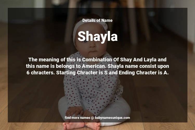 The name Shayla is chosen by those who are willing to find Unique Transgenders Baby Names. The meaning of this is Combination Of Shay And Layla and this name is belongs to American Origin. Baby Name Shayla consist upon 6 chracters. Starting alphabet is S and ending alphabet is A. This name is used primarily by parents who are considering unique baby names for Transgenders. The Zodiac Sign suitbale for this name are;