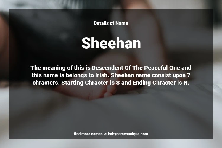 The name Sheehan is chosen by those who are willing to find Unique Transgenders Baby Names. The meaning of this is Descendent Of The Peaceful One and this name is belongs to Irish Origin. Baby Name Sheehan consist upon 7 chracters. Starting alphabet is S and ending alphabet is N. This name is used primarily by parents who are considering unique baby names for Transgenders. The Zodiac Sign suitbale for this name are;