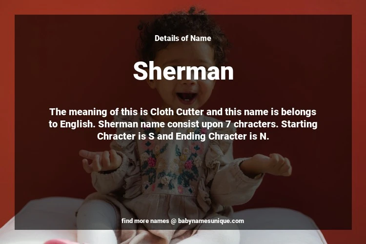 The name Sherman is chosen by those who are willing to find Unique Boy Baby Names. The meaning of this is Cloth Cutter and this name is belongs to English Origin. Baby Name Sherman consist upon 7 chracters. Starting alphabet is S and ending alphabet is N. This name is used primarily by parents who are considering unique baby names for Boy. The Zodiac Sign suitbale for this name are;