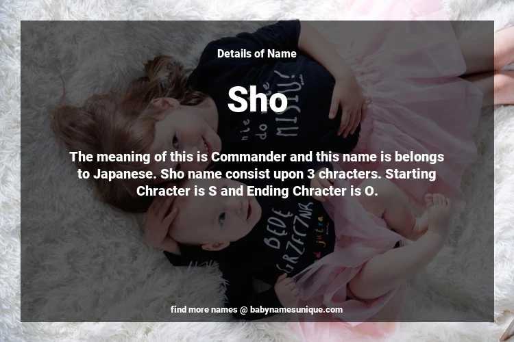 The name Sho is chosen by those who are willing to find Unique Boy Baby Names. The meaning of this is Commander and this name is belongs to Japanese Origin. Baby Name Sho consist upon 3 chracters. Starting alphabet is S and ending alphabet is O. This name is used primarily by parents who are considering unique baby names for Boy. The Zodiac Sign suitbale for this name are;