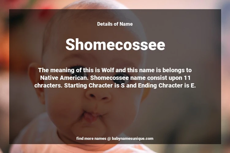The name Shomecossee is chosen by those who are willing to find Unique Transgenders Baby Names. The meaning of this is Wolf and this name is belongs to Native American Origin. Baby Name Shomecossee consist upon 11 chracters. Starting alphabet is S and ending alphabet is E. This name is used primarily by parents who are considering unique baby names for Transgenders. The Zodiac Sign suitbale for this name are;