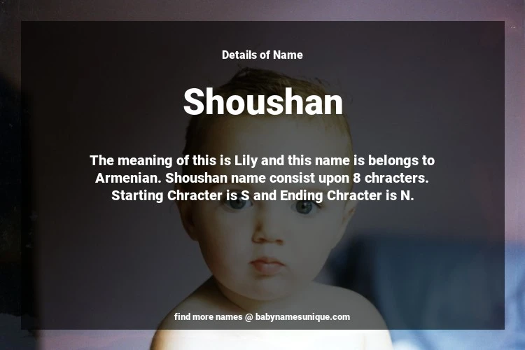 The name Shoushan is chosen by those who are willing to find Unique Transgenders Baby Names. The meaning of this is Lily and this name is belongs to Armenian Origin. Baby Name Shoushan consist upon 8 chracters. Starting alphabet is S and ending alphabet is N. This name is used primarily by parents who are considering unique baby names for Transgenders. The Zodiac Sign suitbale for this name are;