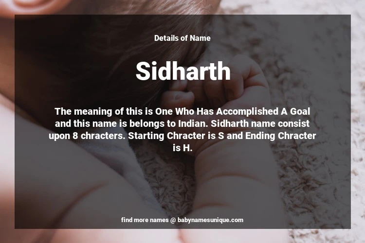 The name Sidharth is chosen by those who are willing to find Unique Boy Baby Names. The meaning of this is One Who Has Accomplished A Goal and this name is belongs to Indian Origin. Baby Name Sidharth consist upon 8 chracters. Starting alphabet is S and ending alphabet is H. This name is used primarily by parents who are considering unique baby names for Boy. The Zodiac Sign suitbale for this name are;