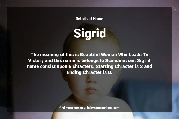 The name Sigrid is chosen by those who are willing to find Unique Transgenders Baby Names. The meaning of this is Beautiful Woman Who Leads To Victory and this name is belongs to Scandinavian Origin. Baby Name Sigrid consist upon 6 chracters. Starting alphabet is S and ending alphabet is D. This name is used primarily by parents who are considering unique baby names for Transgenders. The Zodiac Sign suitbale for this name are;