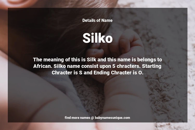 The name Silko is chosen by those who are willing to find Unique Boy Baby Names. The meaning of this is Silk and this name is belongs to African Origin. Baby Name Silko consist upon 5 chracters. Starting alphabet is S and ending alphabet is O. This name is used primarily by parents who are considering unique baby names for Boy. The Zodiac Sign suitbale for this name are;