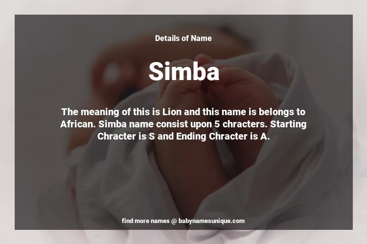 The name Simba is chosen by those who are willing to find Unique Boy Baby Names. The meaning of this is Lion and this name is belongs to African Origin. Baby Name Simba consist upon 5 chracters. Starting alphabet is S and ending alphabet is A. This name is used primarily by parents who are considering unique baby names for Boy. The Zodiac Sign suitbale for this name are;