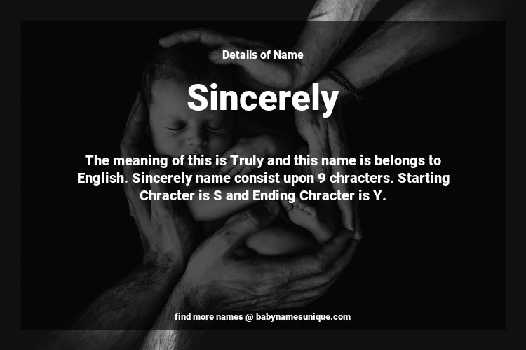The name Sincerely is chosen by those who are willing to find Unique Transgenders Baby Names. The meaning of this is Truly and this name is belongs to English Origin. Baby Name Sincerely consist upon 9 chracters. Starting alphabet is S and ending alphabet is Y. This name is used primarily by parents who are considering unique baby names for Transgenders. The Zodiac Sign suitbale for this name are;