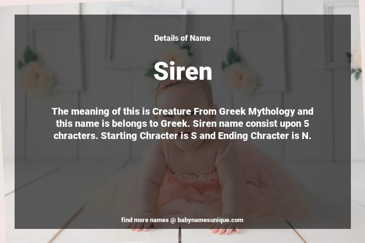 The name Siren is chosen by those who are willing to find Unique Transgenders Baby Names. The meaning of this is Creature From Greek Mythology and this name is belongs to Greek Origin. Baby Name Siren consist upon 5 chracters. Starting alphabet is S and ending alphabet is N. This name is used primarily by parents who are considering unique baby names for Transgenders. The Zodiac Sign suitbale for this name are;