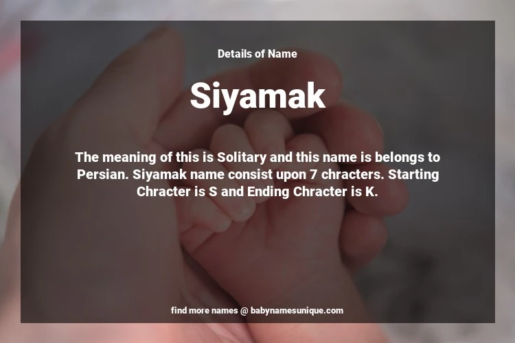 The name Siyamak is chosen by those who are willing to find Unique Boy Baby Names. The meaning of this is Solitary and this name is belongs to Persian Origin. Baby Name Siyamak consist upon 7 chracters. Starting alphabet is S and ending alphabet is K. This name is used primarily by parents who are considering unique baby names for Boy. The Zodiac Sign suitbale for this name are;