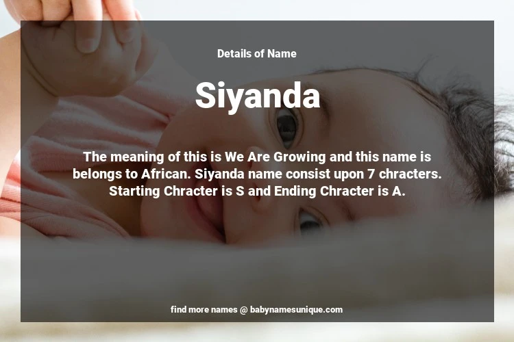 The name Siyanda is chosen by those who are willing to find Unique Transgenders Baby Names. The meaning of this is We Are Growing and this name is belongs to African Origin. Baby Name Siyanda consist upon 7 chracters. Starting alphabet is S and ending alphabet is A. This name is used primarily by parents who are considering unique baby names for Transgenders. The Zodiac Sign suitbale for this name are;