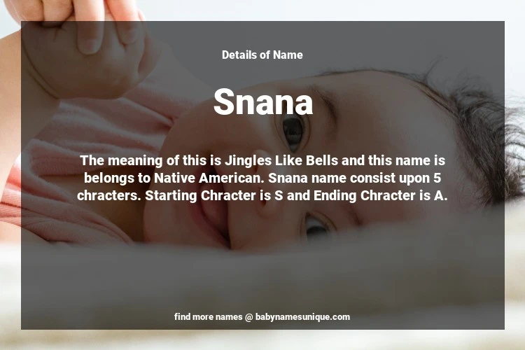The name Snana is chosen by those who are willing to find Unique Transgenders Baby Names. The meaning of this is Jingles Like Bells and this name is belongs to Native American Origin. Baby Name Snana consist upon 5 chracters. Starting alphabet is S and ending alphabet is A. This name is used primarily by parents who are considering unique baby names for Transgenders. The Zodiac Sign suitbale for this name are;