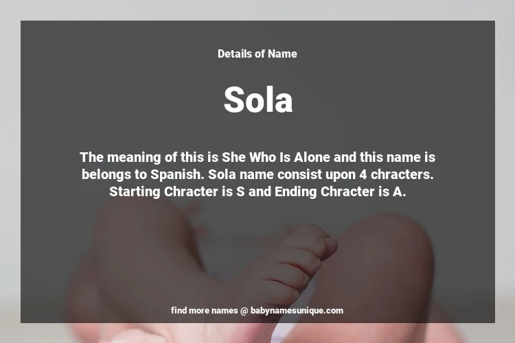 The name Sola is chosen by those who are willing to find Unique Transgenders Baby Names. The meaning of this is She Who Is Alone and this name is belongs to Spanish Origin. Baby Name Sola consist upon 4 chracters. Starting alphabet is S and ending alphabet is A. This name is used primarily by parents who are considering unique baby names for Transgenders. The Zodiac Sign suitbale for this name are;