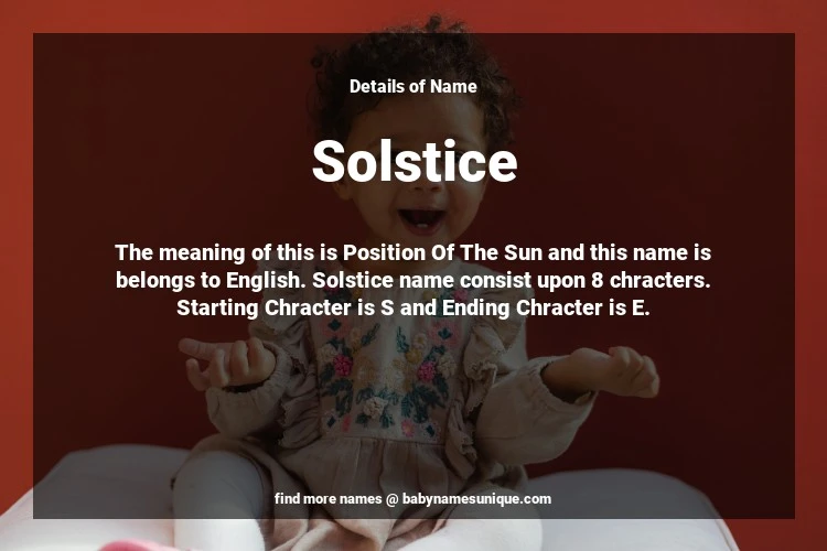 The name Solstice is chosen by those who are willing to find Unique Transgenders Baby Names. The meaning of this is Position Of The Sun and this name is belongs to English Origin. Baby Name Solstice consist upon 8 chracters. Starting alphabet is S and ending alphabet is E. This name is used primarily by parents who are considering unique baby names for Transgenders. The Zodiac Sign suitbale for this name are;