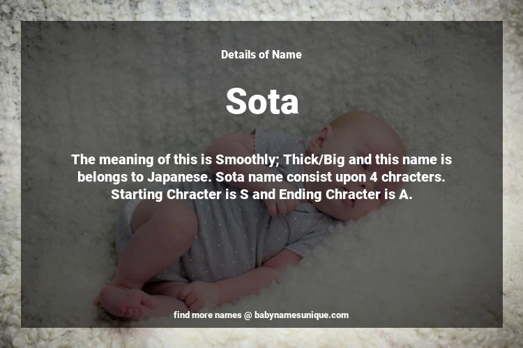 The name Sota is chosen by those who are willing to find Unique Boy Baby Names. The meaning of this is Smoothly; Thick/Big and this name is belongs to Japanese Origin. Baby Name Sota consist upon 4 chracters. Starting alphabet is S and ending alphabet is A. This name is used primarily by parents who are considering unique baby names for Boy. The Zodiac Sign suitbale for this name are;