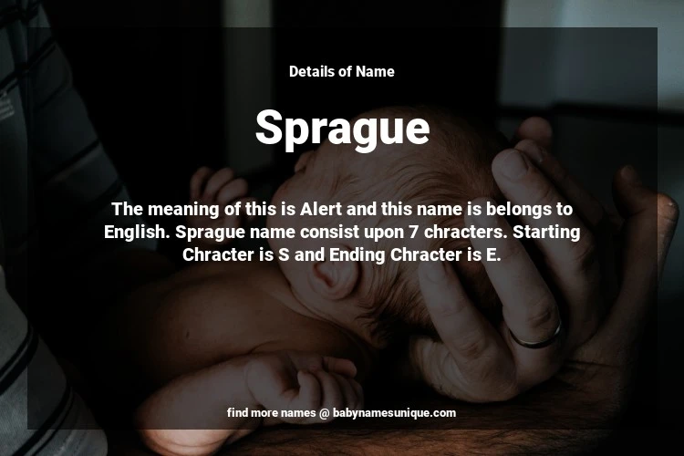 The name Sprague is chosen by those who are willing to find Unique Boy Baby Names. The meaning of this is Alert and this name is belongs to English Origin. Baby Name Sprague consist upon 7 chracters. Starting alphabet is S and ending alphabet is E. This name is used primarily by parents who are considering unique baby names for Boy. The Zodiac Sign suitbale for this name are;