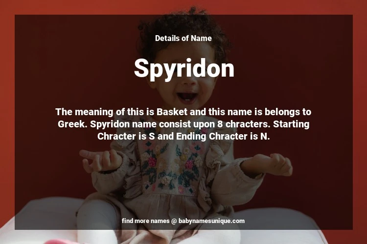 The name Spyridon is chosen by those who are willing to find Unique Boy Baby Names. The meaning of this is Basket and this name is belongs to Greek Origin. Baby Name Spyridon consist upon 8 chracters. Starting alphabet is S and ending alphabet is N. This name is used primarily by parents who are considering unique baby names for Boy. The Zodiac Sign suitbale for this name are;