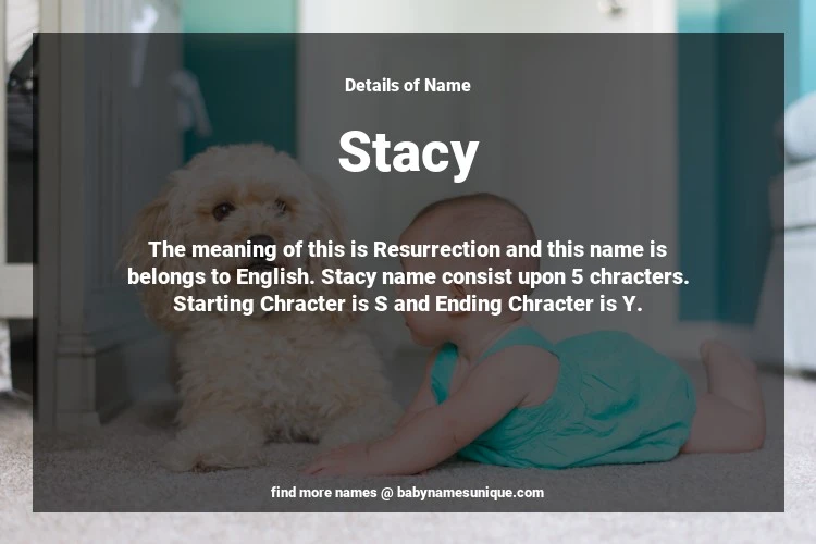 The name Stacy is chosen by those who are willing to find Unique Transgenders Baby Names. The meaning of this is Resurrection and this name is belongs to English Origin. Baby Name Stacy consist upon 5 chracters. Starting alphabet is S and ending alphabet is Y. This name is used primarily by parents who are considering unique baby names for Transgenders. The Zodiac Sign suitbale for this name are;
