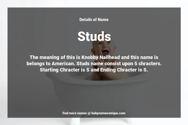 The name Studs is chosen by those who are willing to find Unique Boy Baby Names. The meaning of this is Knobby Nailhead and this name is belongs to American Origin. Baby Name Studs consist upon 5 chracters. Starting alphabet is S and ending alphabet is S. This name is used primarily by parents who are considering unique baby names for Boy. The Zodiac Sign suitbale for this name are;