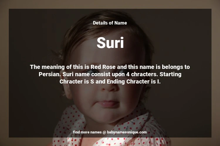 The name Suri is chosen by those who are willing to find Unique Transgenders Baby Names. The meaning of this is Red Rose and this name is belongs to Persian Origin. Baby Name Suri consist upon 4 chracters. Starting alphabet is S and ending alphabet is I. This name is used primarily by parents who are considering unique baby names for Transgenders. The Zodiac Sign suitbale for this name are;