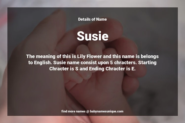 The name Susie is chosen by those who are willing to find Unique Transgenders Baby Names. The meaning of this is Lily Flower and this name is belongs to English Origin. Baby Name Susie consist upon 5 chracters. Starting alphabet is S and ending alphabet is E. This name is used primarily by parents who are considering unique baby names for Transgenders. The Zodiac Sign suitbale for this name are;