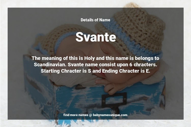 The name Svante is chosen by those who are willing to find Unique Transgenders Baby Names. The meaning of this is Holy and this name is belongs to Scandinavian Origin. Baby Name Svante consist upon 6 chracters. Starting alphabet is S and ending alphabet is E. This name is used primarily by parents who are considering unique baby names for Transgenders. The Zodiac Sign suitbale for this name are;