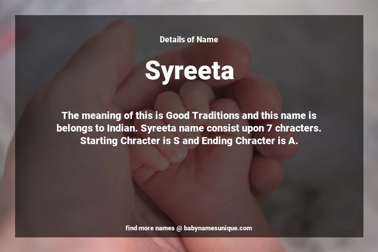The name Syreeta is chosen by those who are willing to find Unique Transgenders Baby Names. The meaning of this is Good Traditions and this name is belongs to Indian Origin. Baby Name Syreeta consist upon 7 chracters. Starting alphabet is S and ending alphabet is A. This name is used primarily by parents who are considering unique baby names for Transgenders. The Zodiac Sign suitbale for this name are;
