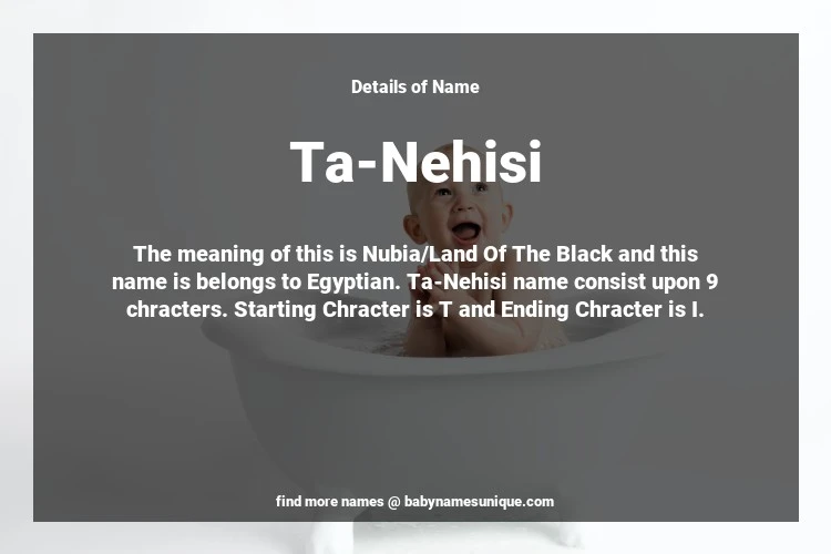 The name Ta-Nehisi is chosen by those who are willing to find Unique Transgenders Baby Names. The meaning of this is Nubia/Land Of The Black and this name is belongs to Egyptian Origin. Baby Name Ta-Nehisi consist upon 9 chracters. Starting alphabet is T and ending alphabet is I. This name is used primarily by parents who are considering unique baby names for Transgenders. The Zodiac Sign suitbale for this name are;