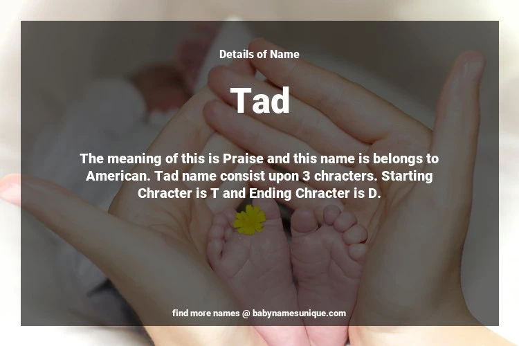 The name Tad is chosen by those who are willing to find Unique Boy Baby Names. The meaning of this is Praise and this name is belongs to American Origin. Baby Name Tad consist upon 3 chracters. Starting alphabet is T and ending alphabet is D. This name is used primarily by parents who are considering unique baby names for Boy. The Zodiac Sign suitbale for this name are;