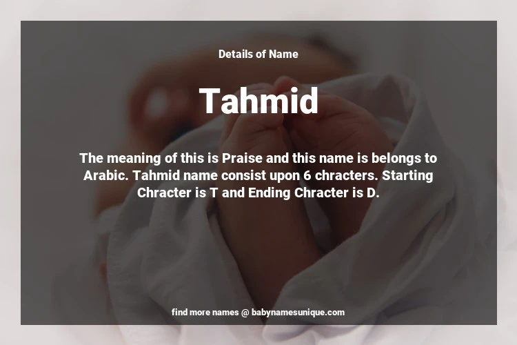 The name Tahmid is chosen by those who are willing to find Unique Boy Baby Names. The meaning of this is Praise and this name is belongs to Arabic Origin. Baby Name Tahmid consist upon 6 chracters. Starting alphabet is T and ending alphabet is D. This name is used primarily by parents who are considering unique baby names for Boy. The Zodiac Sign suitbale for this name are;