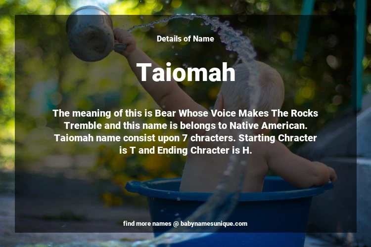 The name Taiomah is chosen by those who are willing to find Unique Boy Baby Names. The meaning of this is Bear Whose Voice Makes The Rocks Tremble and this name is belongs to Native American Origin. Baby Name Taiomah consist upon 7 chracters. Starting alphabet is T and ending alphabet is H. This name is used primarily by parents who are considering unique baby names for Boy. The Zodiac Sign suitbale for this name are;