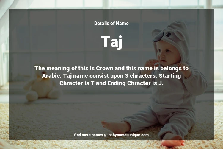 The name Taj is chosen by those who are willing to find Unique Boy Baby Names. The meaning of this is Crown and this name is belongs to Arabic Origin. Baby Name Taj consist upon 3 chracters. Starting alphabet is T and ending alphabet is J. This name is used primarily by parents who are considering unique baby names for Boy. The Zodiac Sign suitbale for this name are;