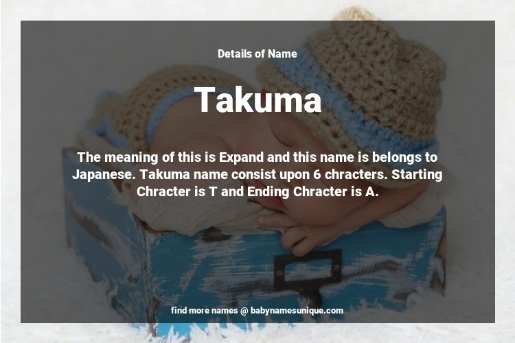 The name Takuma is chosen by those who are willing to find Unique Boy Baby Names. The meaning of this is Expand and this name is belongs to Japanese Origin. Baby Name Takuma consist upon 6 chracters. Starting alphabet is T and ending alphabet is A. This name is used primarily by parents who are considering unique baby names for Boy. The Zodiac Sign suitbale for this name are;