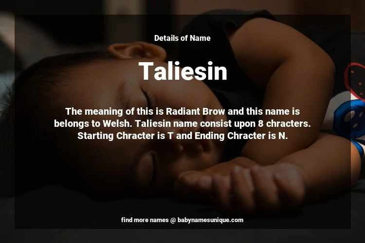 The name Taliesin is chosen by those who are willing to find Unique Boy Baby Names. The meaning of this is Radiant Brow and this name is belongs to Welsh Origin. Baby Name Taliesin consist upon 8 chracters. Starting alphabet is T and ending alphabet is N. This name is used primarily by parents who are considering unique baby names for Boy. The Zodiac Sign suitbale for this name are;