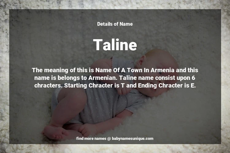 The name Taline is chosen by those who are willing to find Unique Transgenders Baby Names. The meaning of this is Name Of A Town In Armenia and this name is belongs to Armenian Origin. Baby Name Taline consist upon 6 chracters. Starting alphabet is T and ending alphabet is E. This name is used primarily by parents who are considering unique baby names for Transgenders. The Zodiac Sign suitbale for this name are;