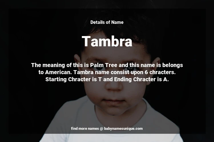 The name Tambra is chosen by those who are willing to find Unique Transgenders Baby Names. The meaning of this is Palm Tree and this name is belongs to American Origin. Baby Name Tambra consist upon 6 chracters. Starting alphabet is T and ending alphabet is A. This name is used primarily by parents who are considering unique baby names for Transgenders. The Zodiac Sign suitbale for this name are;