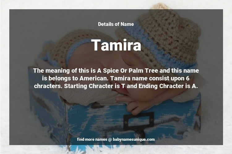 The name Tamira is chosen by those who are willing to find Unique Transgenders Baby Names. The meaning of this is A Spice Or Palm Tree and this name is belongs to American Origin. Baby Name Tamira consist upon 6 chracters. Starting alphabet is T and ending alphabet is A. This name is used primarily by parents who are considering unique baby names for Transgenders. The Zodiac Sign suitbale for this name are;