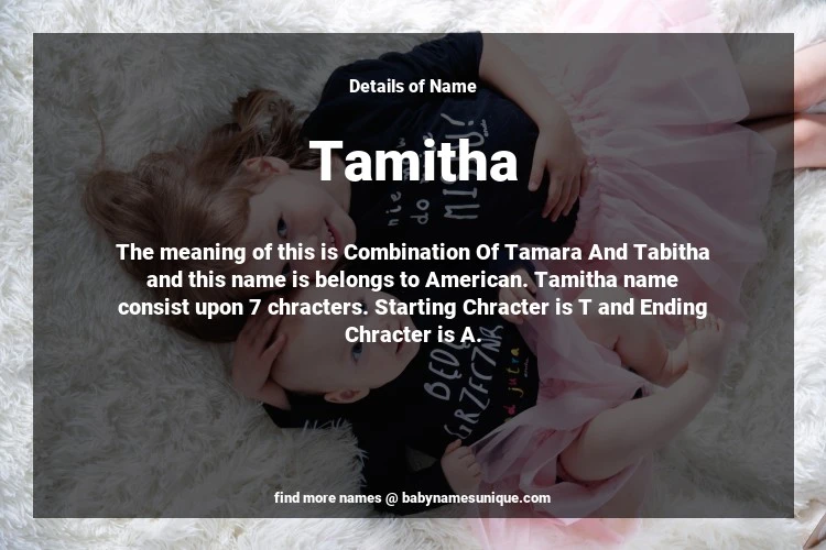 The name Tamitha is chosen by those who are willing to find Unique Transgenders Baby Names. The meaning of this is Combination Of Tamara And Tabitha and this name is belongs to American Origin. Baby Name Tamitha consist upon 7 chracters. Starting alphabet is T and ending alphabet is A. This name is used primarily by parents who are considering unique baby names for Transgenders. The Zodiac Sign suitbale for this name are;