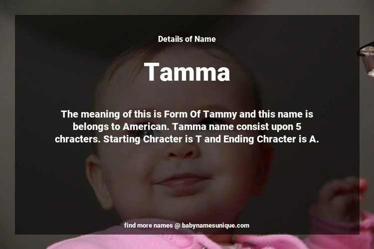 The name Tamma is chosen by those who are willing to find Unique Transgenders Baby Names. The meaning of this is Form Of Tammy and this name is belongs to American Origin. Baby Name Tamma consist upon 5 chracters. Starting alphabet is T and ending alphabet is A. This name is used primarily by parents who are considering unique baby names for Transgenders. The Zodiac Sign suitbale for this name are;