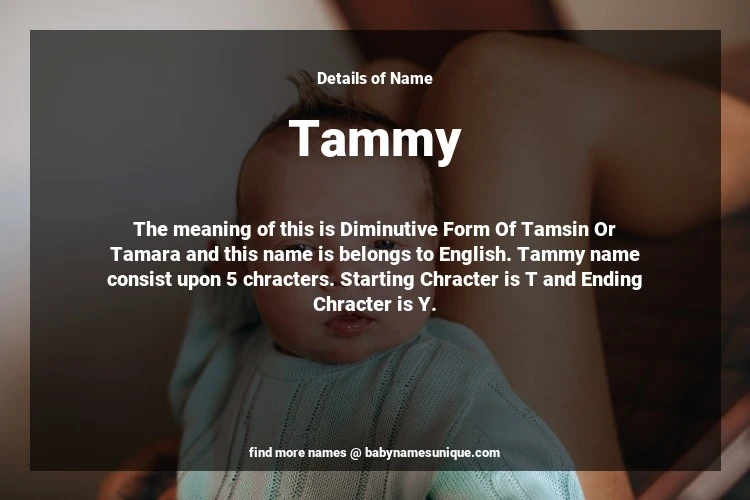 The name Tammy is chosen by those who are willing to find Unique Transgenders Baby Names. The meaning of this is Diminutive Form Of Tamsin Or Tamara and this name is belongs to English Origin. Baby Name Tammy consist upon 5 chracters. Starting alphabet is T and ending alphabet is Y. This name is used primarily by parents who are considering unique baby names for Transgenders. The Zodiac Sign suitbale for this name are;