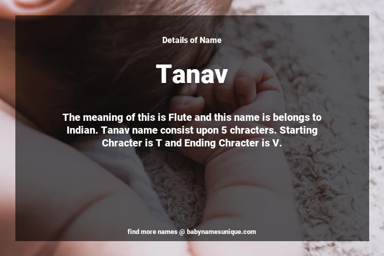 The name Tanav is chosen by those who are willing to find Unique Boy Baby Names. The meaning of this is Flute and this name is belongs to Indian Origin. Baby Name Tanav consist upon 5 chracters. Starting alphabet is T and ending alphabet is V. This name is used primarily by parents who are considering unique baby names for Boy. The Zodiac Sign suitbale for this name are;