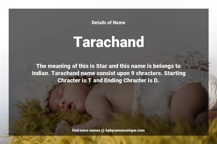 The name Tarachand is chosen by those who are willing to find Unique Transgenders Baby Names. The meaning of this is Star and this name is belongs to Indian Origin. Baby Name Tarachand consist upon 9 chracters. Starting alphabet is T and ending alphabet is D. This name is used primarily by parents who are considering unique baby names for Transgenders. The Zodiac Sign suitbale for this name are;