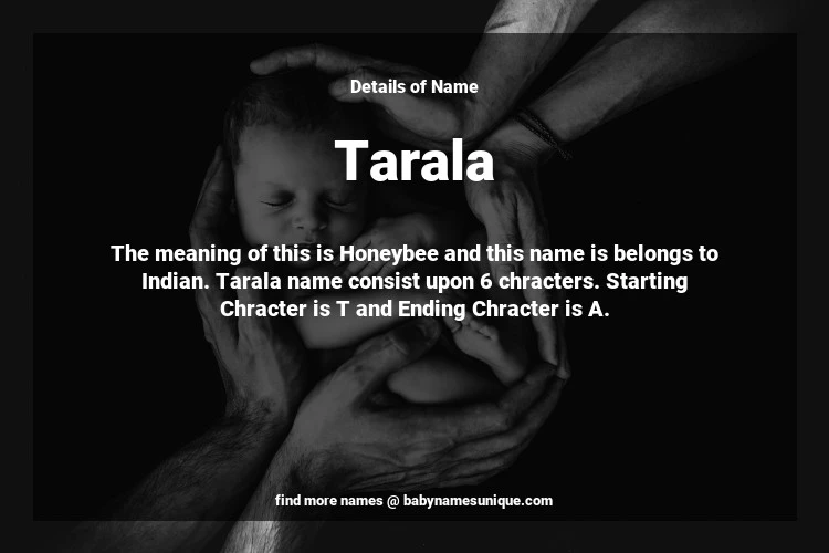 The name Tarala is chosen by those who are willing to find Unique Transgenders Baby Names. The meaning of this is Honeybee and this name is belongs to Indian Origin. Baby Name Tarala consist upon 6 chracters. Starting alphabet is T and ending alphabet is A. This name is used primarily by parents who are considering unique baby names for Transgenders. The Zodiac Sign suitbale for this name are;