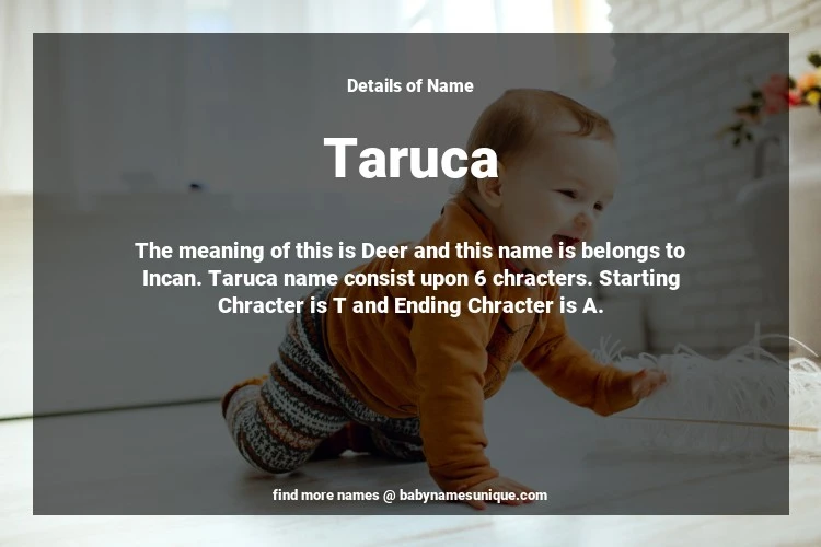 The name Taruca is chosen by those who are willing to find Unique Transgenders Baby Names. The meaning of this is Deer and this name is belongs to Incan Origin. Baby Name Taruca consist upon 6 chracters. Starting alphabet is T and ending alphabet is A. This name is used primarily by parents who are considering unique baby names for Transgenders. The Zodiac Sign suitbale for this name are;