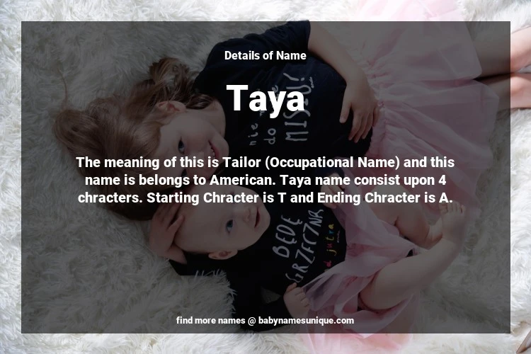 The name Taya is chosen by those who are willing to find Unique Transgenders Baby Names. The meaning of this is Tailor (Occupational Name) and this name is belongs to American Origin. Baby Name Taya consist upon 4 chracters. Starting alphabet is T and ending alphabet is A. This name is used primarily by parents who are considering unique baby names for Transgenders. The Zodiac Sign suitbale for this name are;
