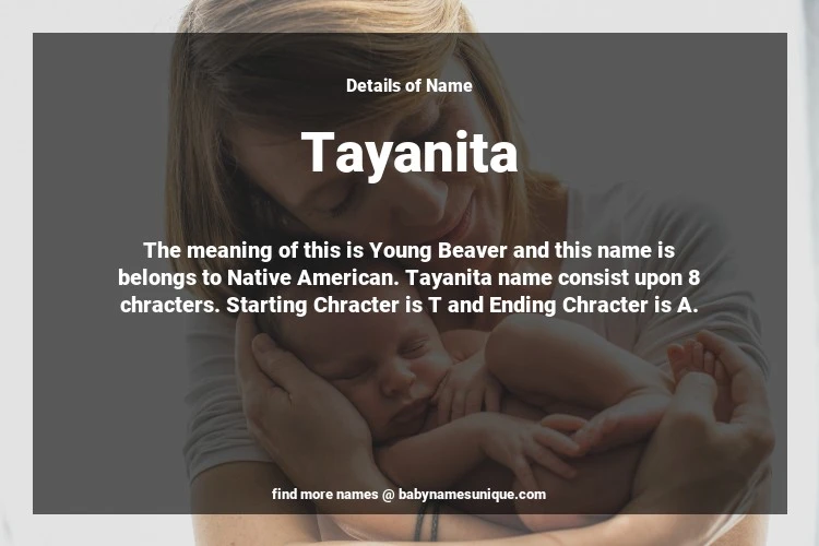 The name Tayanita is chosen by those who are willing to find Unique Transgenders Baby Names. The meaning of this is Young Beaver and this name is belongs to Native American Origin. Baby Name Tayanita consist upon 8 chracters. Starting alphabet is T and ending alphabet is A. This name is used primarily by parents who are considering unique baby names for Transgenders. The Zodiac Sign suitbale for this name are;